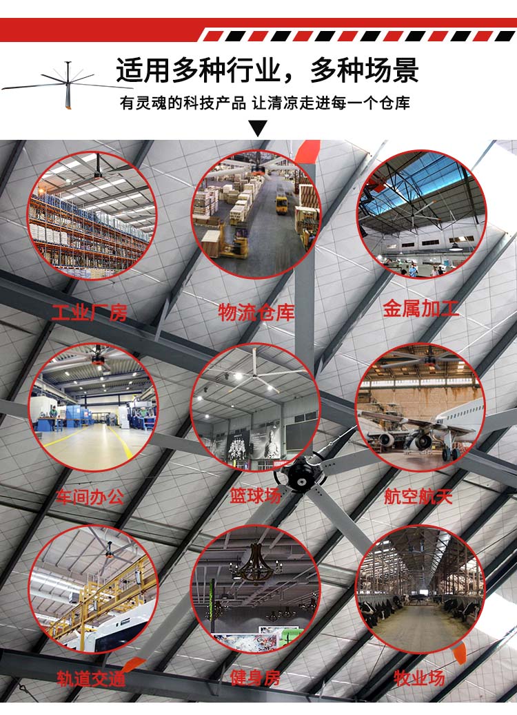 工業(yè)大風扇廣泛應用于工業(yè)廠房、物流倉庫、配送中心、汽車4S店、機場車站、展覽館、體育館、軍事訓練營、大型賣場等高大空間,作為高大空間通風,人工降溫的首選解決方案。